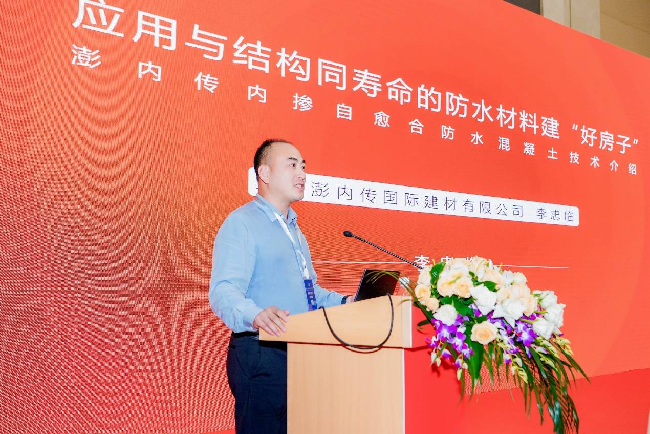 北京澎內(nèi)傳國際建材有限公司市場總監(jiān)李忠臨以《與結(jié)構(gòu)同壽命防水材料助力建造“好房子”》為題作了專題報告,首先總結(jié)分析了當(dāng)前建筑物滲漏的主要原因,然后介紹了澎內(nèi)傳防水系統(tǒng)的機(jī)理、性能與技術(shù)特點(diǎn),可從根本上解決滲漏問題,最后與大家分享了澎內(nèi)傳結(jié)晶自愈合防水混凝土在工程中的應(yīng)用情況。